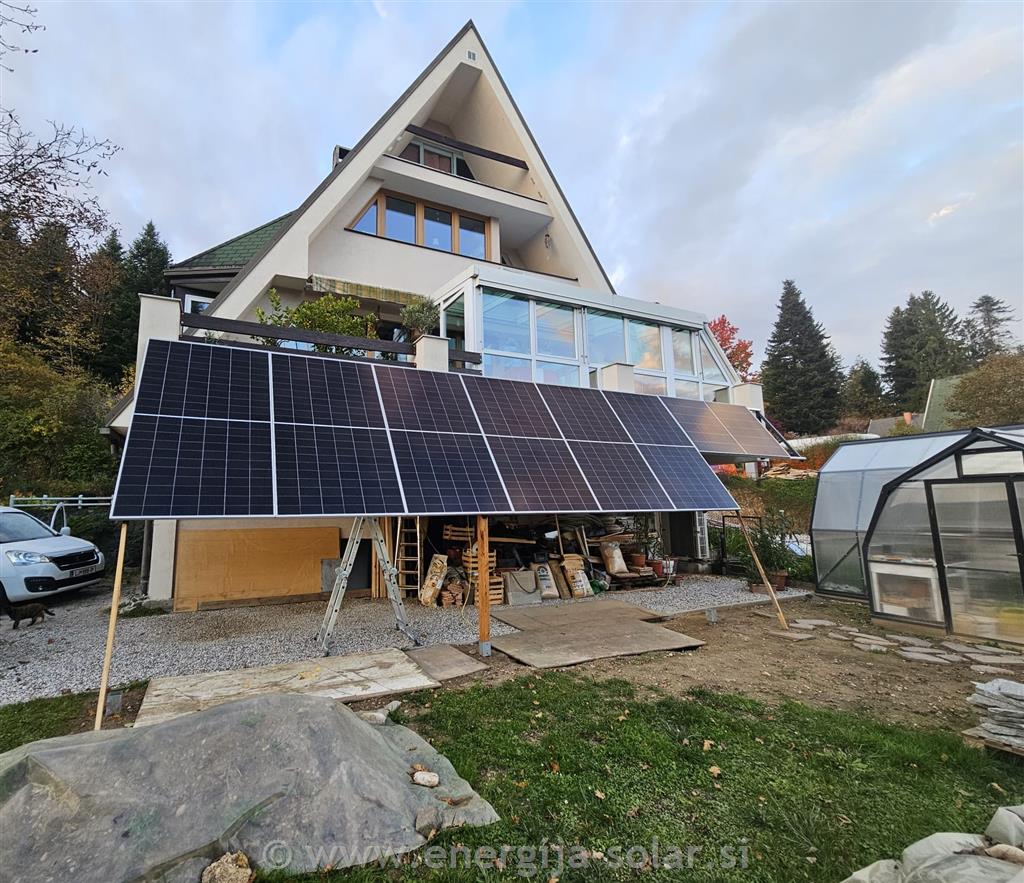 V okolici Ljubljane smo uspešno izvedli montažo sončne elektrarne s hranilnikom energije in izjemno zmogljivimi 700 W fotonapetostnimi moduli. Zaradi lastne izdelave podkonstrukcije smo lahko sistem optimalno prilagodili za idealni zimski kot, saj je v tem obdobju poraba elektrike najvišja. Takšna postavitev zagotavlja odličen izkoristek sončne energije skozi vse leto – pozimi omogoča večjo proizvodnjo, poleti pa kljub strmejšemu kotu še vedno zadostno količino energije. Sistem vključuje tudi funkcijo Smart Load, ki samodejno aktivira grelce ali druge porabnike le ob presežkih proizvodnje. Na ta način omogoča maksimalen izkoristek proizvedene energije in dodatne prihranke pri porabi elektrike.