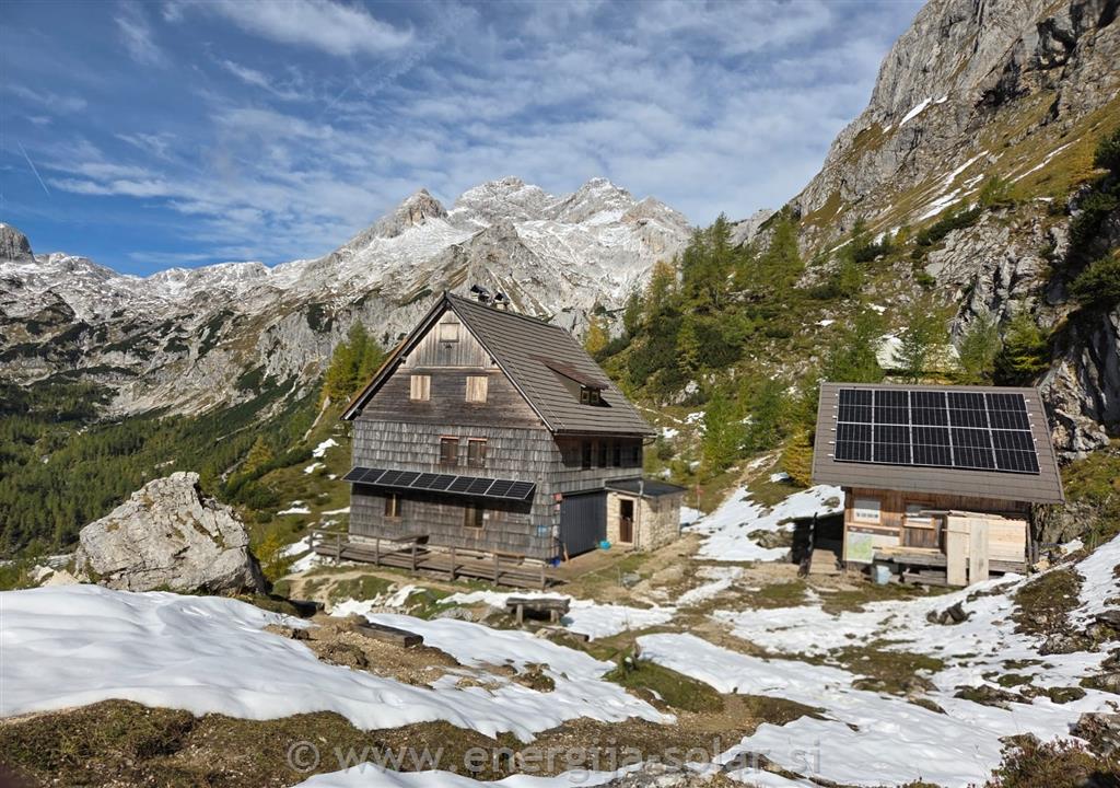 Elektrarna je nadgrajena na 10 kWp sončnih modulov in 60 kWh hranilnika, moč razsmernika pa je povečana iz 3 kW na 16 kW, kar omogoča sočasno uporabo več porabnikov ter enako moč kot v povprečnem gospodinjstvu. Paneli so nameščeni na steno objekta pod idealnim kotom poletnega sonca, kar smo dosegli z lastno izdelavo podkonstrukcije in tako zagotovili najboljši izkoristek proizvodnje energije v času sezone delovanja koče.