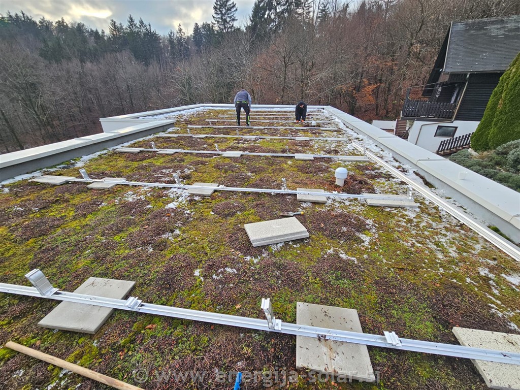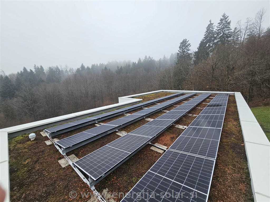 V okolici Ljubljane smo izvedli montažo sončne elektrarne moči 16,32 kWp z baterijskim hranilnikom kapacitete 20 kWh. Objekt ima ravno streho z nasutjem, v celoti poraslo z naravno razraščenim rastlinjem, kar je zahtevalo prilagojen pristop k izvedbi. Z ustrezno izbrano podkonstrukcijo smo zagotovili stabilno in varno postavitev brez posegov v hidroizolacijo strehe ter dolgoročno zanesljivo delovanje sistema. Elektrarna omogoča visoko stopnjo samooskrbe in neodvisnost od elektroenergetskega omrežja.